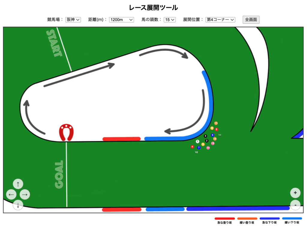 スタート・各コーナー・直線の馬の位置を可視化して、レース展開の予想に役立ちます。