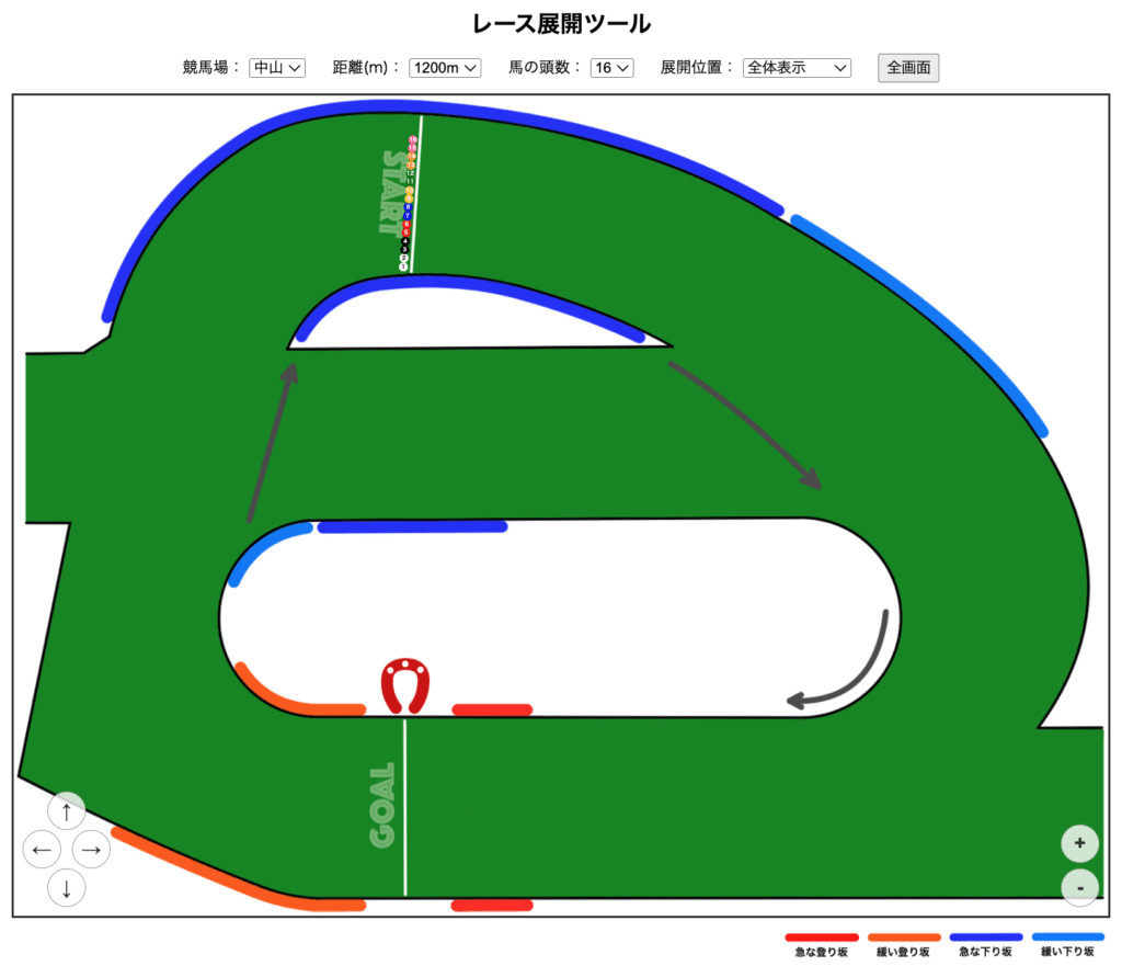 スタート・各コーナー・直線の馬の位置を可視化して、レース展開の予想に役立ちます。