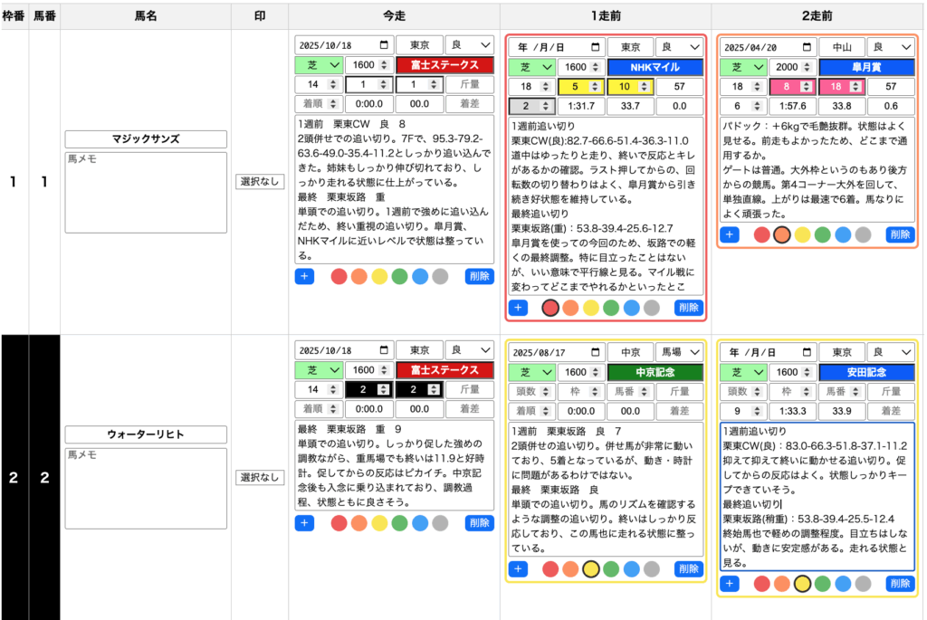競馬予想において最も大事なのは馬の特徴やレース内容の言語化。それを全てメモ・管理できます。馬やレースの入力はご自身で行うことになりますが、全て無料でご利用いただけますのでぜひご活用ください!