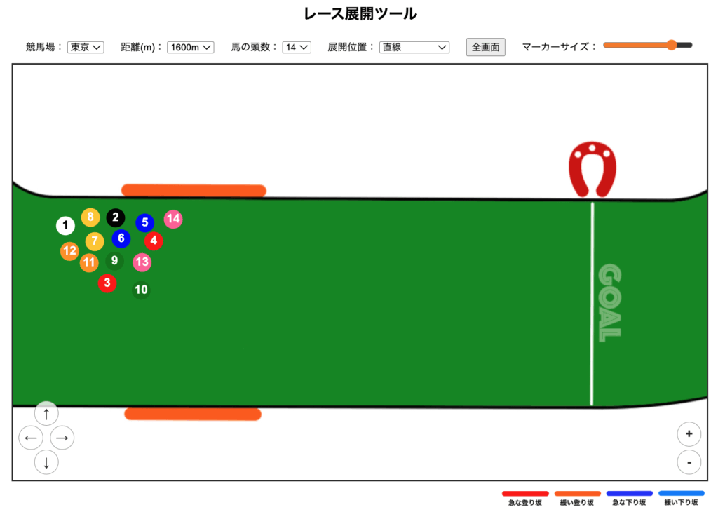 スタート・各コーナー・直線の馬の位置を可視化して、レース展開の予想に役立ちます。